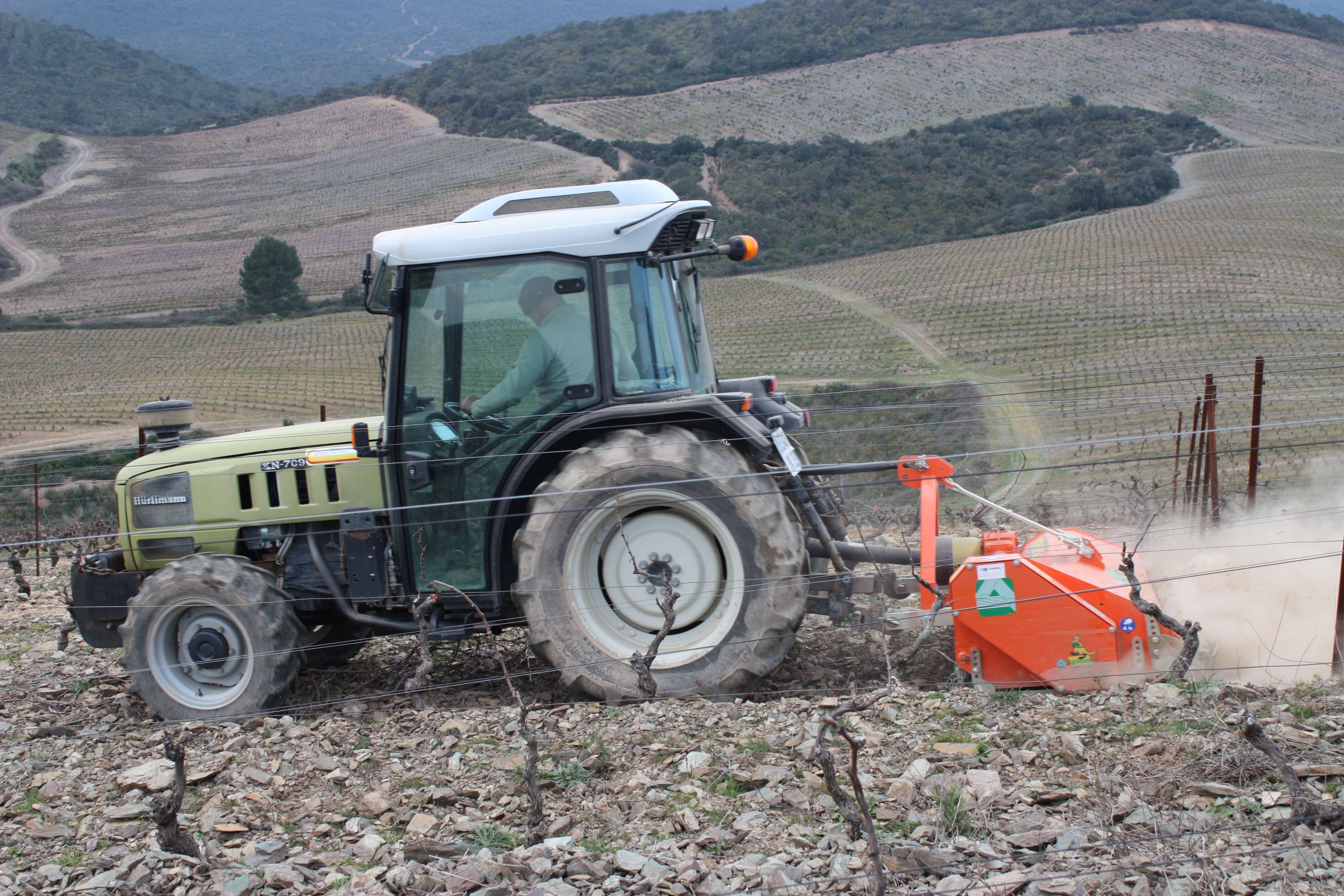 Henri s’active à broyer les 16 hectares avant d’amener la bête au Mas Janeil pour le broyage des vignes plantées à 2m50.